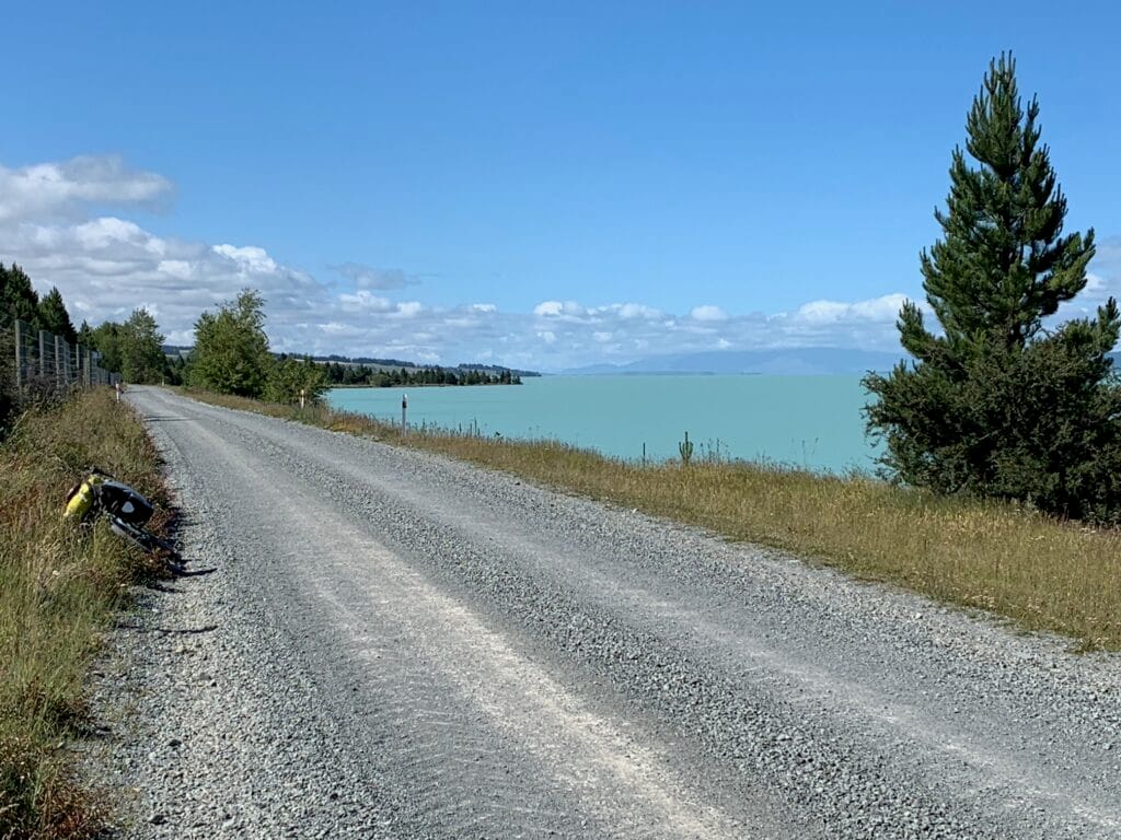 The riding was peaceful, the gravel roads smooth and well maintained. For much of the way we had the lake on one side and the mountains on the other — a classic South Island scene of wide open space and sharp light, even with the clouds hanging low.