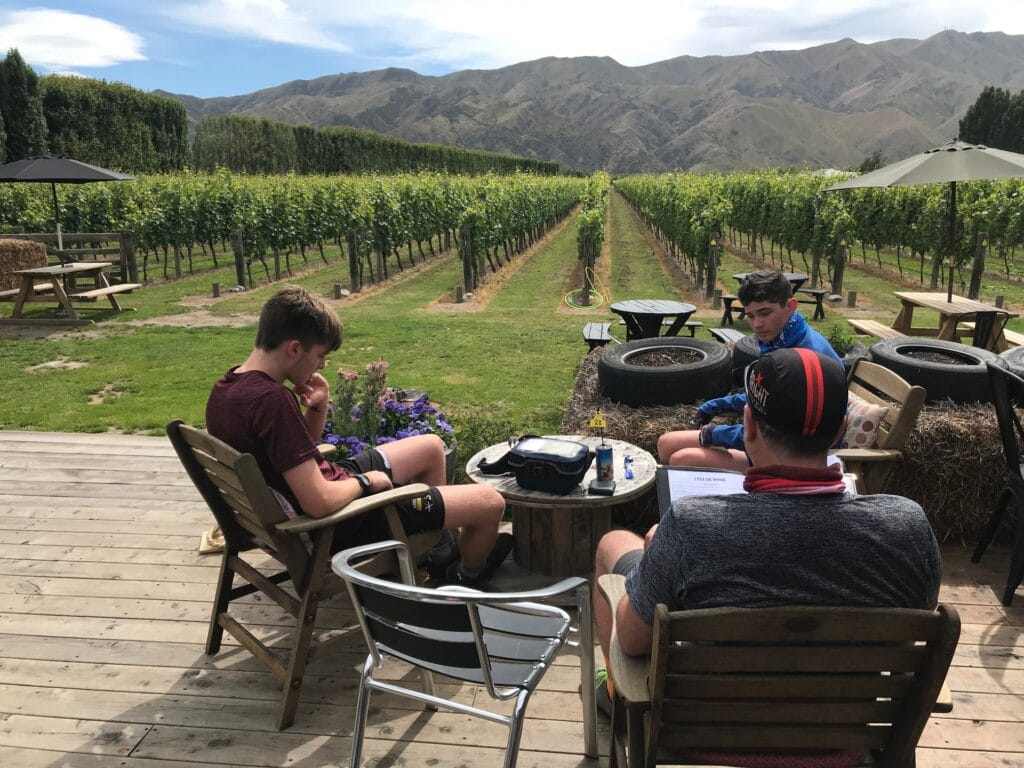 Getting to the start of the trails took some careful planning. From Clyde, we organised a taxi large enough to carry four bikes and all our gear — a challenge in itself — and made the trip through Cromwell and the spectacular Kawarau Gorge. It’s a beautiful drive, but one we knew would have been unsafe for the boys on bikes given the narrow, winding roads and heavy traffic. The transfer dropped us off at Peregrine Winery in Gibbston Valley, where our Queenstown riding adventure began.