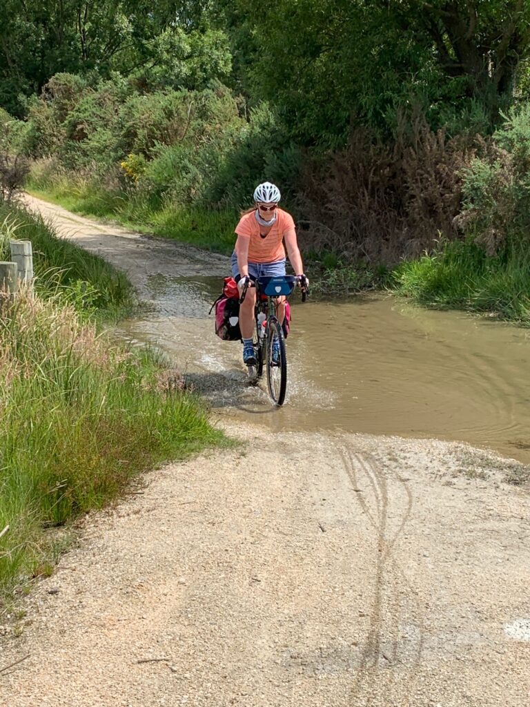 We set out along the trail under drizzly skies, the gravel damp but rideable, and the landscape already wide and open — a different kind of beauty from the Alps to Ocean, more pastoral and rolling. The boys made their own fun along the way, trying to cover each other in mud as they navigated the puddles that lined the track — laughter echoing across the quiet plains.